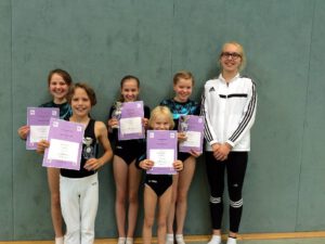 Weitere TG-Starterinnen bei dem Gau-Schüler-Pokal waren Jule Thuinemann (3. Platz) und Mia Spitzmüller, die in Stadtlohn ihren ersten Wettkampf turnte und gleich auch noch eine schwierigere Übung zeigte als viele ihrer Konkurrentinnen. Für eine Finale-Teilnahme reichte es am Ende mit knappen mit 3/10-Punkten Rückstand dann leider doch nicht ganz.